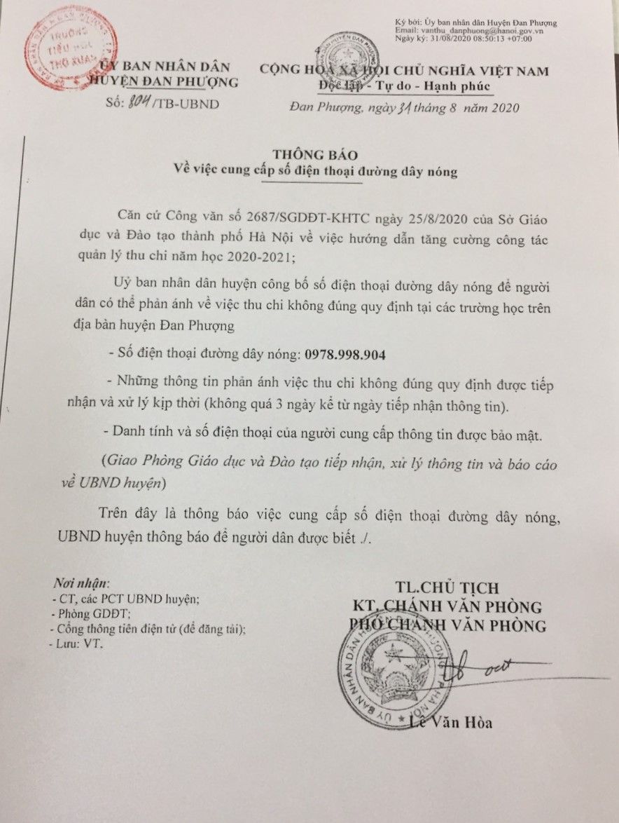 UBND huyện Đan Phượng công bố số điện thoại đường dây nóng để người dân có thể phản ánh về việc thu chi không đúng quy định tại các trường học trên địa bàn huyện.